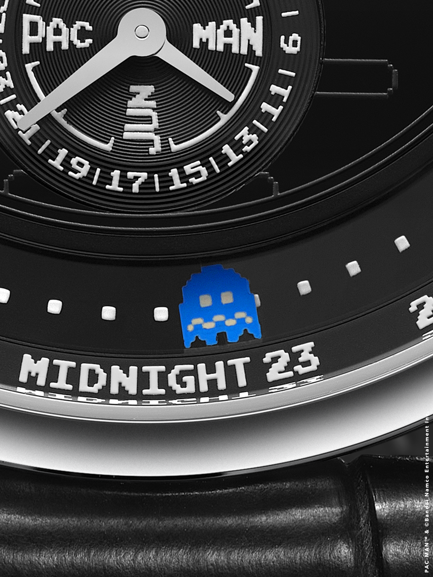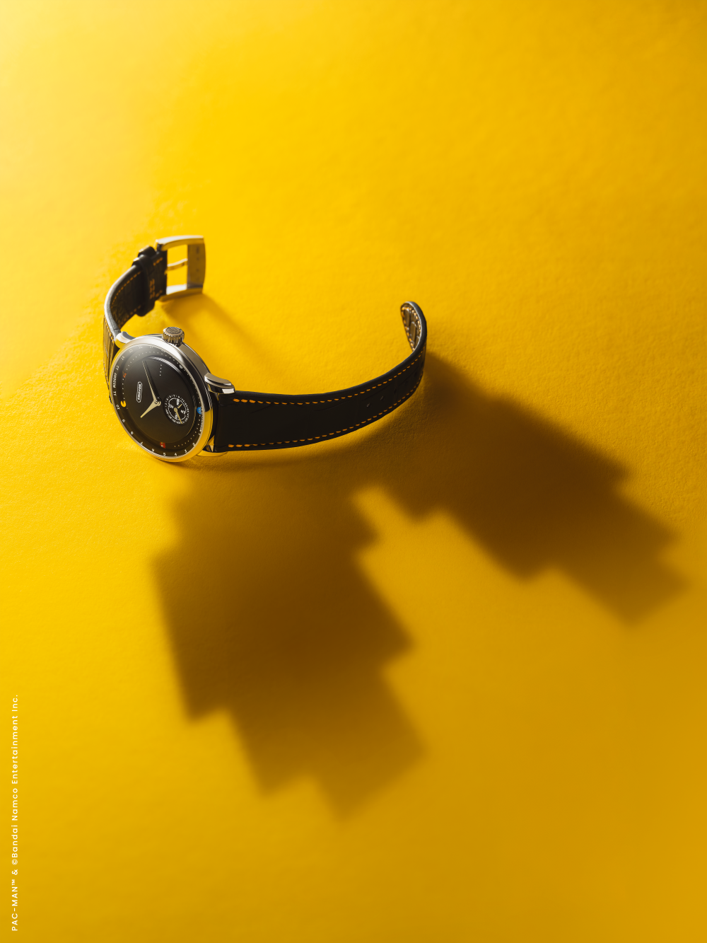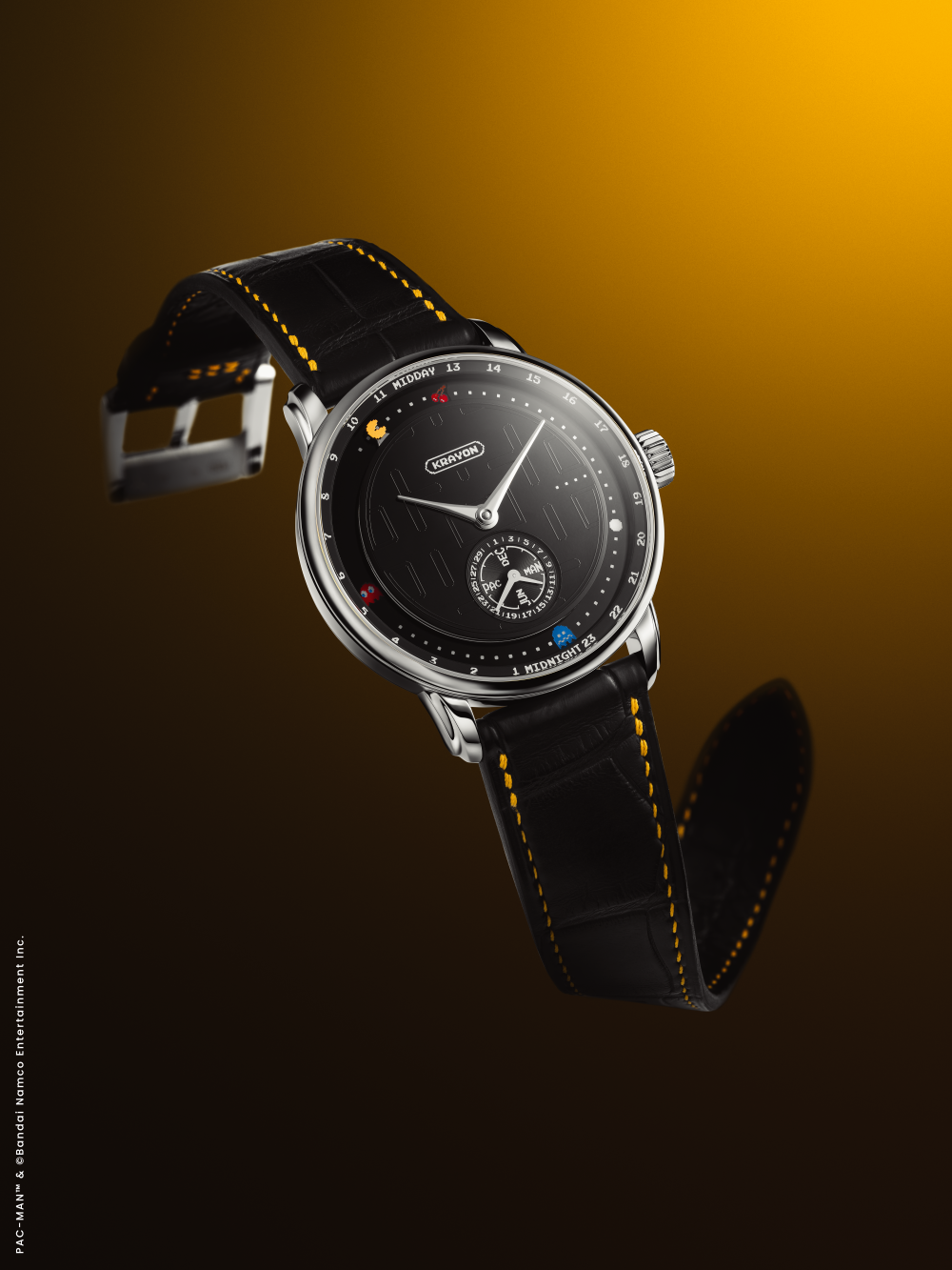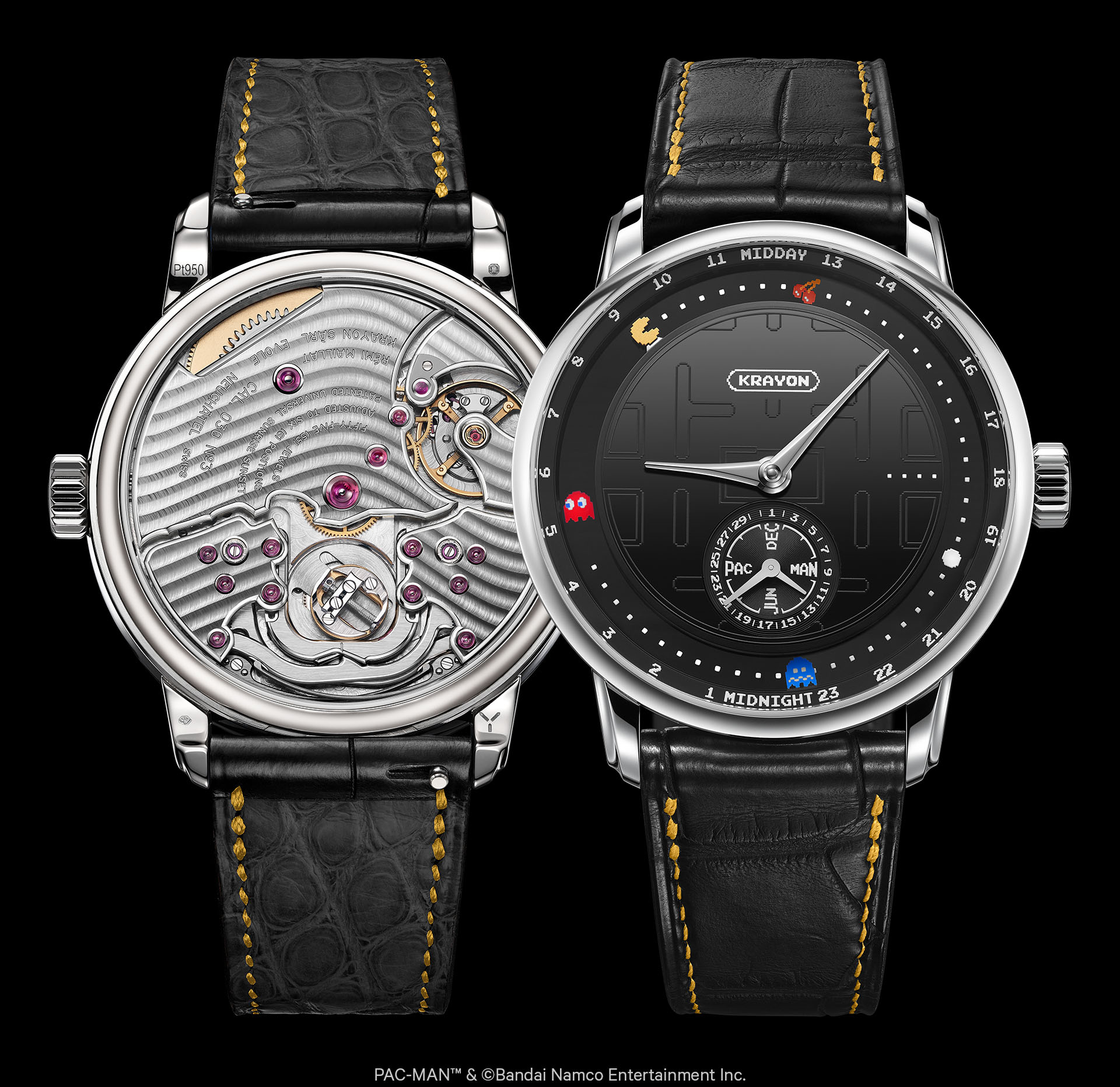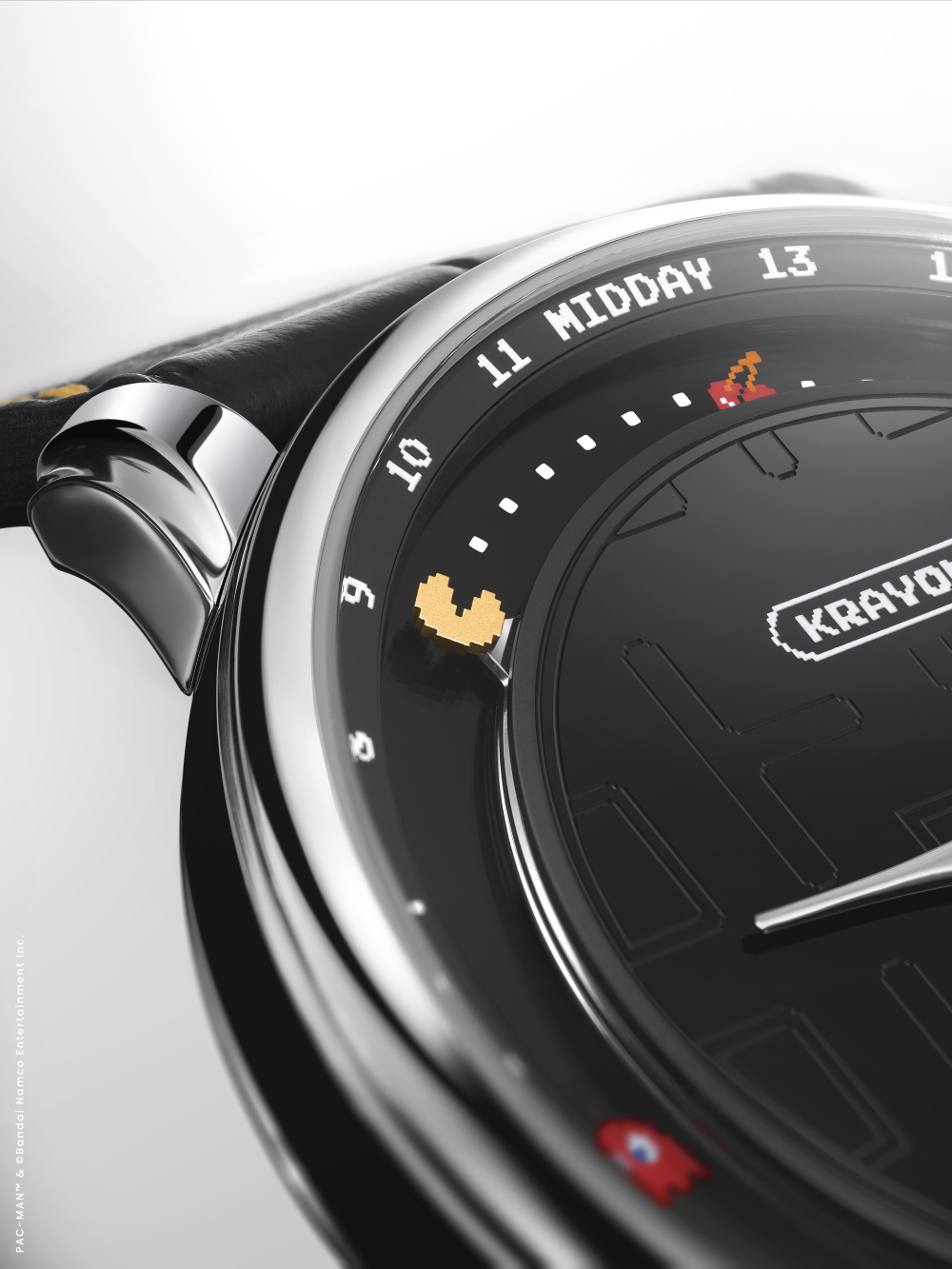 Krayon 的創辦人兼製錶師 Rémi Maillat 與伴侶 Fei Hou 共同屬於 PAC-MAN 世代,他們將對時間的深刻理解,轉化為這個充滿玩味的腕錶設計。錶款保留了「Anywhere」機芯計算全球任一地點日出日落時間的核心功能,並將其遊戲化:錶盤上的黃色主角 PAC-MAN 扮演日/夜指示,沿著軌跡前進,吞食代表時間循環的點和果實。當 PAC-MAN 吃到「偉大的暮光餅乾」時,夜間模式隨即開啟。設計上,品牌回歸1980年原作的視覺風格,在拋光縞瑪瑙錶盤上,以精密的移印技術呈現半透明的經典迷宮,而果實與幽靈則以手工繪製,每一個細節都體現了高級製錶的嚴謹與藝術的精確。