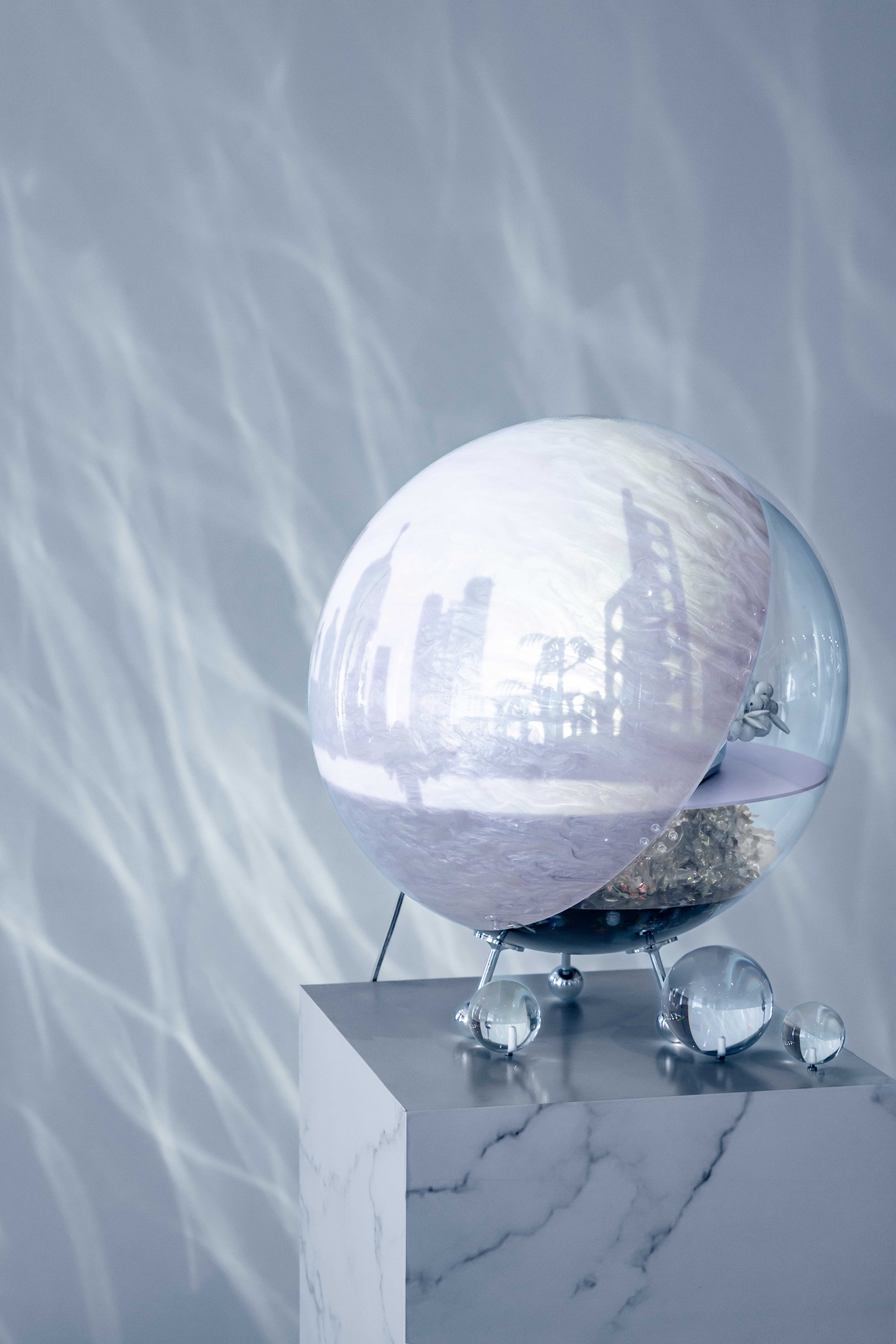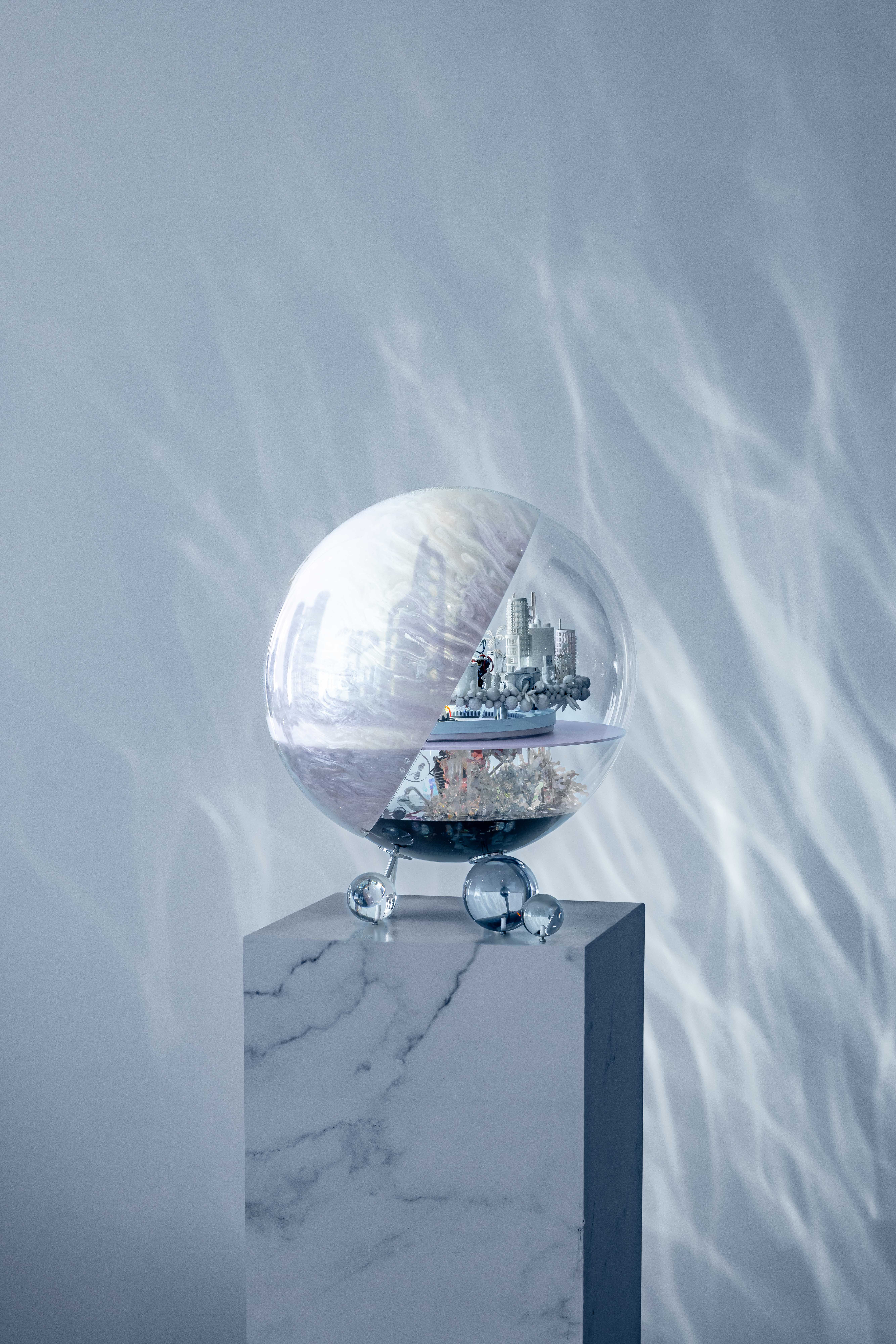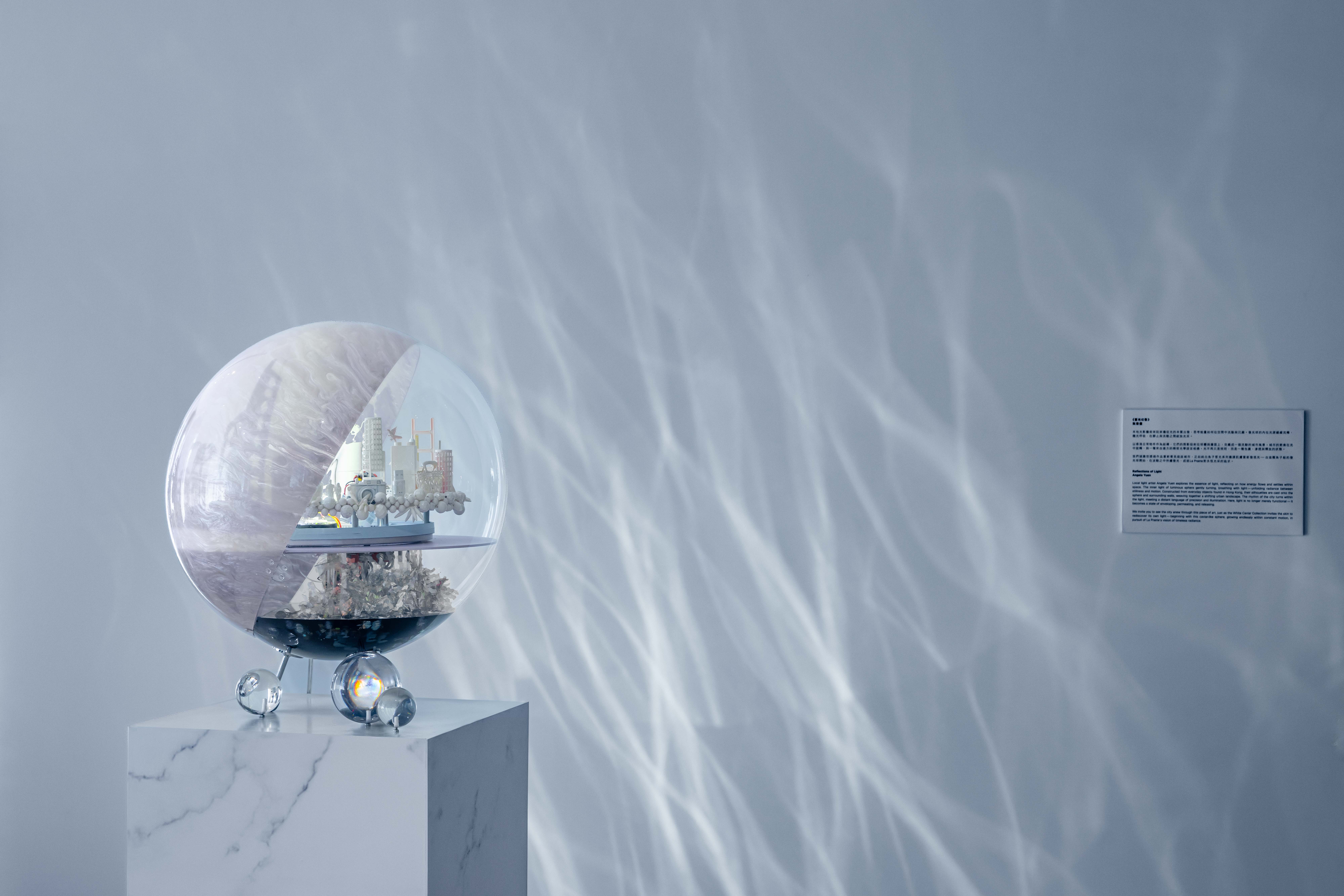 發光球作品內置緩緩流轉的光源,隨著光的呼吸,展現出靜止與流動之間的奇幻轉換。球體內的空間以香港日常物件為結構元素,這些物件的剪影投射在球體與牆面上,交織出一幅流動的城市風景。城市的節奏在光影中旋轉,宛如來自遠方的精密光學語言與本地繁華的街景相遇,光不僅能照明,而且是一種包裹、滲透與釋放的生命狀態。