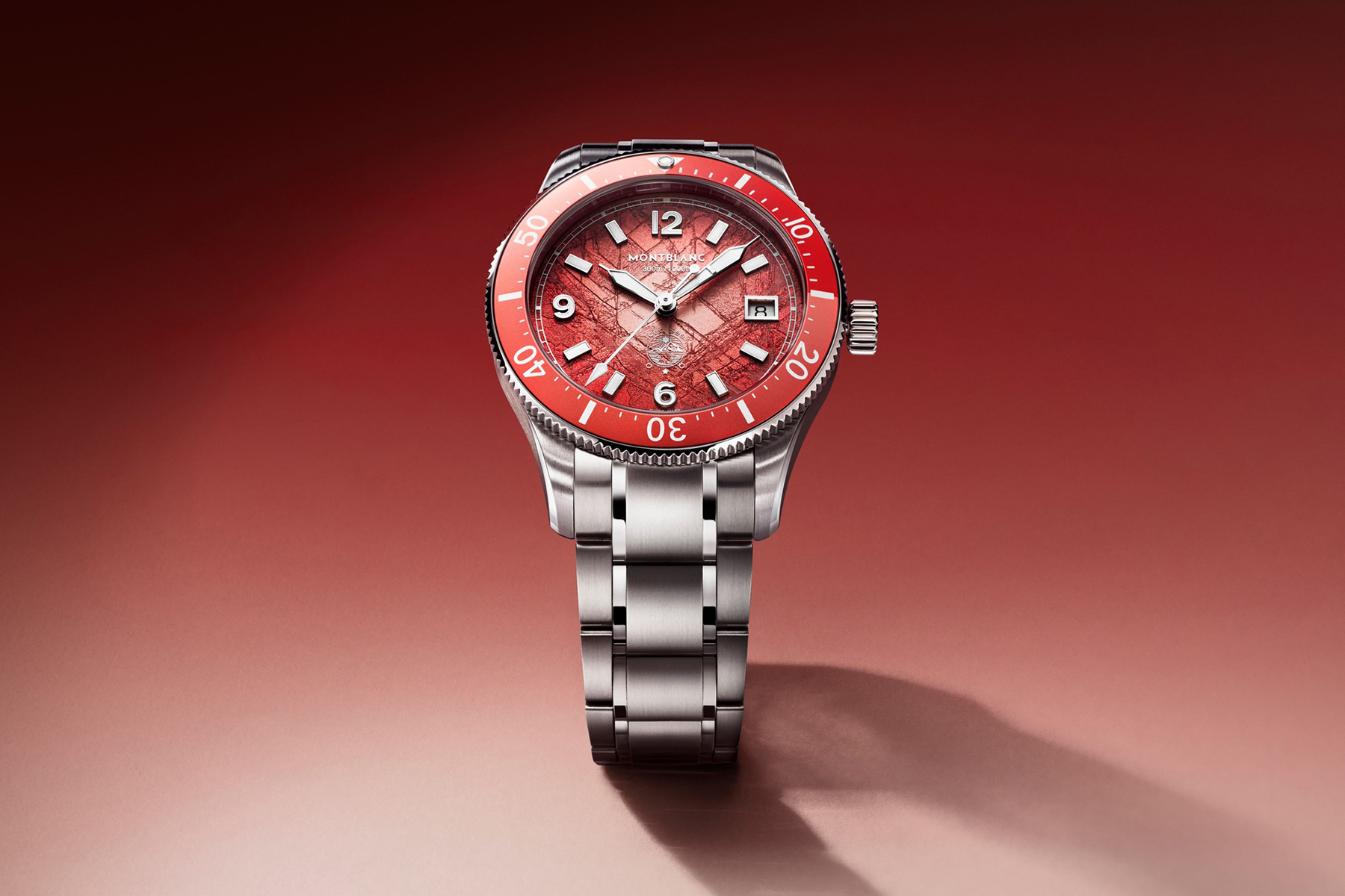 另外限量300枚Montblanc Iced Sea 系列 0 Oxygen 日期顯示自動機械腕錶,靈感源自於白朗峰山脈最大的冰川——「冰海冰川」(Mer de Glace)。儘管冰川因積雪覆蓋常被聯想為白色或灰色,但在溫暖季節往往會呈現出瑰麗的色彩。黎明與黃昏時分,尤其是在夏季,冰川會在錯綜複雜的晶體結構中倒映出天空絢麗的色彩。腕錶的冰川圖案錶盤以珊瑚色調呈現。這個充滿活力的配色也延伸到腕錶的雙色鋁製錶圈鑲嵌上,珊瑚色與紅色的搭配使腕錶更加易讀。
