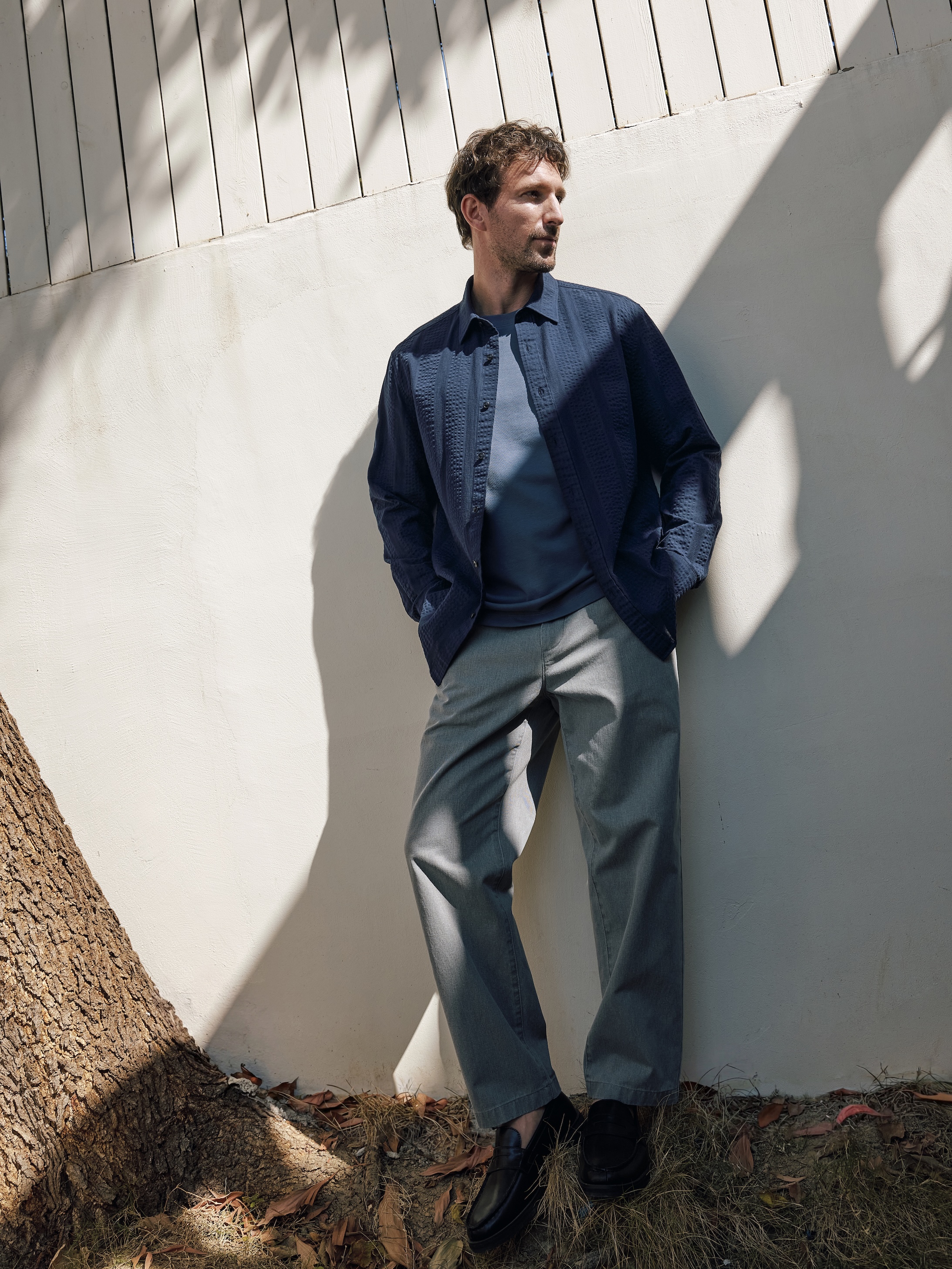 設計細節方面,Blue Soleil系列的靈感來自度假村瓷磚的 waffle 紋理,帶來細膩的觸感與獨特的視覺層次。搭配水彩風的樹葉印花,娓娓道出一段關於“Getaway(逃離)”的故事,邀請男士放下繁忙,追尋屬於自己的海岸假期。系列中的每一件單品都展現了豐富的質感與紋理,ONS將蔚藍海岸的節奏與氛圍融入到每一寸布料之中。舒適的Perry Unlined西裝外套,輕盈的亞麻襯衫,無論是日常穿著還是度假出行,都能帶來親膚的觸感與無與倫比的質感體驗。選用高品質的天然面料,讓穿著者在享受時尚美感的同時,也能感受到極致的舒適與自由。